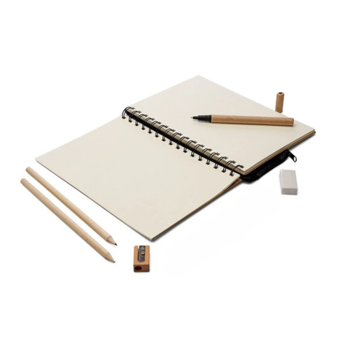 Incluye: 1 Bolígrafo Eco con capuchón, 2 lápices , 1 sacapuntas en madera, 1 goma de borrar, y 1 compas.