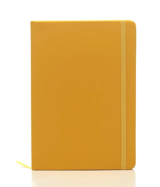 Cuaderno A5 de 80 hojas lisas de 70gr con tapa dura de papel kraft. Cuenta con cierre elástico y marcador